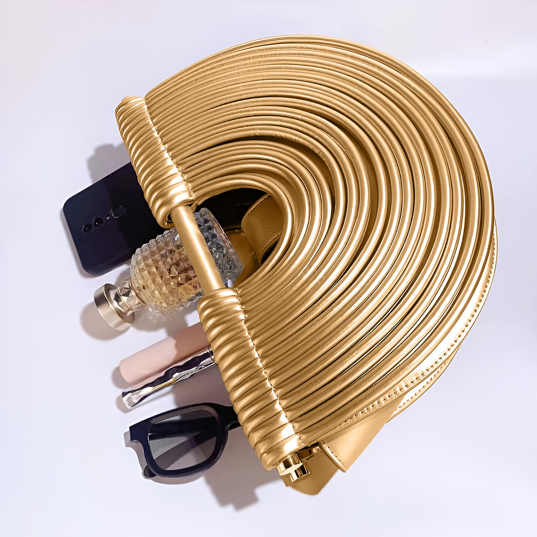 Sa silhouette semi-circulaire distinctive et sa finition métallique brillante attirent le regard avec une élégance affirmée, la rendant parfaite tant pour le raffinement quotidien que pour le charme des soirées spéciales. La bandoulière amovible et la poignée intégrée offrent une polyvalence sans effort, s'adaptant avec grâce à chaque occasion.